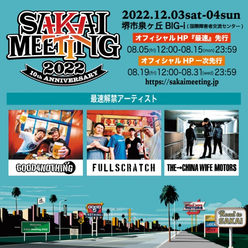 NEWS LIST SAKAI MEETING 2022 第二弾ゲスト発表2022年9月6日 SAKAI MEETING 第一弾ゲスト発表2022年8月25日 【GET READ TOUR 岡山公演 払い戻しに関して】2022年8月10日 【SAKAI MEETING 2022】最速ゲスト発表2022年8月6日 【GET READY TOUR 岡山公演について】2022年7月29日 ドラムサポートメンバー公募!&新アー写公開!2022年7月30日 「GET READY TOUR」開催決定2022年5月22日 【FOUR x NINETEEN vol.2】開催決定2022年3月24日 【GOOD COUNTRY】開催決定2022年3月16日 SAKAI MEETING 2022-10th Annrversary- スタート!2022年3月15日 FLAG TOUR 岡山・千葉・名古屋振替公演について2022年3月9日 GOOD4NOTHING ライブについてのお知らせ2022年3月1日 「FLAG TOUR」岡山 公演開催見合わせのお知らせ2022年2月28日 【FLAG TOUR 振替公演のお知らせ】2022年2月18日 「FLAG TOUR」名古屋・大阪 公演開催見合わせのお知らせ2022年2月17日 【大切なお知らせと振替公演のご案内】2022年2月9日 【「FLAG TOUR」福岡・岡山・渋谷・千葉公演開催見合わせのお知らせ】2022年2月1日 「FLAG TOUR」の渋谷公演ゲスト発表2022年1月22日 GOOD4NOTHING 「FLAG」TOUR ゲスト発表!2022年1月7日 「GET READY」ミュージック・ビデオ公開!2022年1月1日
